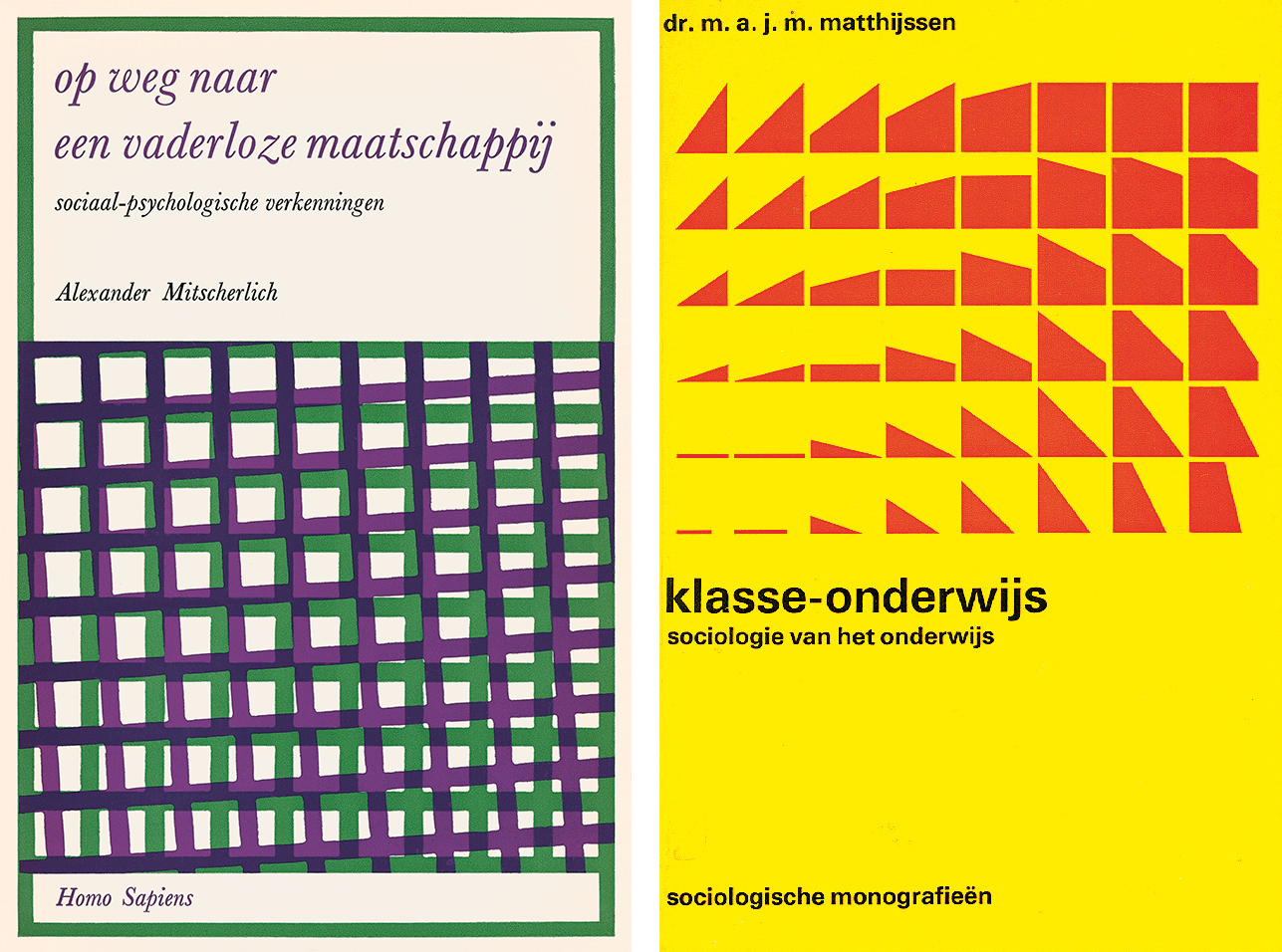 Boekomslag van Op weg naar een vaderloze maatschappij (links), 1968, uitgave Van Loghum Slaterus. Foto: Stedelijk Museum Amsterdam.