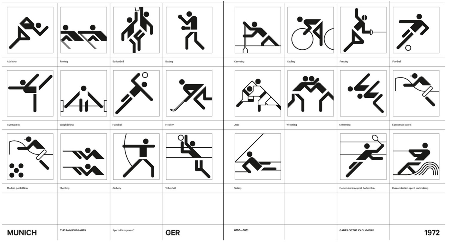 This heightened demand paved the way for the 1972 Munich Olympics, which marked a watershed event in the growth of pictographic design. Organizers faced the challenge of guiding millions of international visitors through unfamiliar places. This marked a turning point in expanding the ISOTYPE’s educational goals into a broader communicative language. The symbols needed to convey actions and direction across language and cultural boundaries.